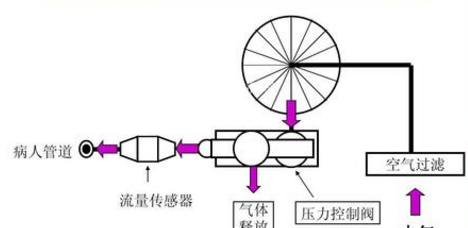 流量傳感器將測量到的實際值饋送到電子控制部分與面板設置值比較,利用兩者間的誤差控制伺服閥門來調節(jié)吸入和呼出氣體流量;