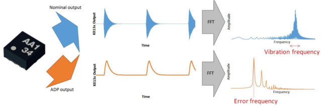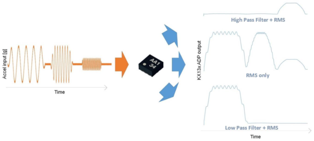 現(xiàn)實世界中的加速度信息(左)由不同頻率和振幅混合而成,KX13x的ADP不僅可以捕獲這些信息,而且能夠輸出指定頻率范圍內(nèi)的加速度振幅(右側(cè)列舉了各種情況示例)。