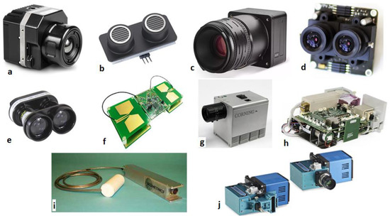 無人機04 00034 g004 550 圖4. 采礦無人機上常用傳感器的示例:(a)紅外傳感器[ 123 ],(b)超聲傳感器[ 124 ],(c)RGB攝像機[ 125 ],(d)立體攝像機[ 126 ],(e)激光測距儀[ 126 ],(f)超寬帶雷達(UWB)[ 127 ],(g)高光譜傳感器[ 128 ],(h)磁傳感器[ 129 ],(i)氣體探測器[ 130 ], (j)可見和近紅外光譜范圍(VNIR)[ 131 ]。