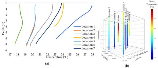 無人機(jī)04 00035 g006 550 圖6. 按位置和水深分布的水溫分布:(a)2D散點圖和(b)3D散點圖。