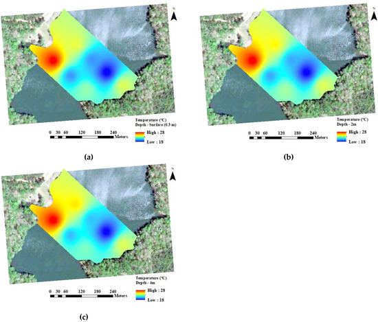 每個位置的測量次數(shù)取決于水深。深度測量表明下降過程中探頭的深度。因此,一旦探頭到達(dá)水柱底部,就有望進(jìn)行重復(fù)測量。在一定深度后重復(fù)進(jìn)行的測量被指定為該采樣位置的最大水深。收集的水深和溫度數(shù)據(jù)用于創(chuàng)建測深圖和水溫圖,以可視化地表(0.3 m)以及2 m和4 m深度處的水溫分布。逆距離加權(quán)插值(IDW)方法用于ArcMap(ESRI,Redlands,CA,美國)中的處理和插值。27 ]。評估水深,水溫和位置之間的關(guān)系。在R軟件(R-GUI,維也納,奧地利)驅(qū)動的3D散點圖中說明了水溫分布[ 28 ]。