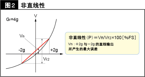 輸出特性呈曲線,連接+2g與-2g的直線輸出所產(chǎn)生的最大誤差即為非直線性。該數(shù)值越小越接近于直線。