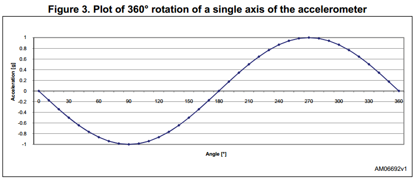 X軸指向旋轉(zhuǎn)360°,ax讀數(shù)將在-1g~1g變化。從曲線可以看出,在接近±90°的位置處,輸出值靈敏度很低(同樣角度變化引起的讀數(shù)改變較。0°附近靈敏度最高。另外也可以看出正弦曲線在[0° 45°], [135° 225°]和[315° 360°] 的線性度較好。