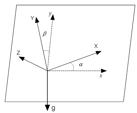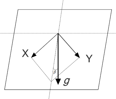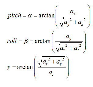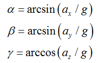 假設(shè)傳感器的X軸與水平面xy之間的夾角為α(稱為俯仰角,pitch),Y軸與水平面間的夾角為β(稱為滾轉(zhuǎn)角,roll),Z軸與重力方向夾角為γ。