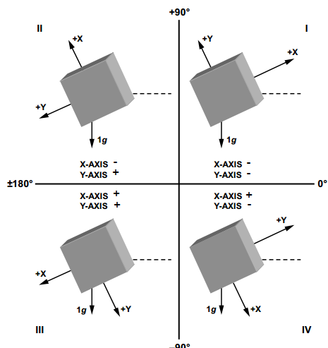 如果操作數(shù)ax/ay為正值,反正切函數(shù)會返回第一象限中的值;如果操作數(shù)為負值,則反正切函數(shù)會返回第四象限中的值(標準反正切函數(shù)atan的值域是-90°~90°,也就是它只處理第一、四象限)。而通過使用C語言標準庫中的另一個反正切函數(shù)atan2(ax , ay),可以計算出原點至點(ax,ay)的方位角,可以理解為復(fù)數(shù)ax+ayi的輻角,取值范圍為(-180°,180°]。因此,增加一個軸的好處之一是,能夠區(qū)分各個象限并在整個360°范圍內(nèi)測量傾角。