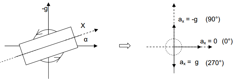 如下圖所示,假設(shè)X軸上測到的加速度值為ax,則傾角α的值為:α = arcsin(ax/g).  如果傾角只在很小的范圍內(nèi)變化,則可以使用近似公式sinα≈α,于是α ≈ k·(ax/g),比例系數(shù)k用于傾角的線性近似計算。