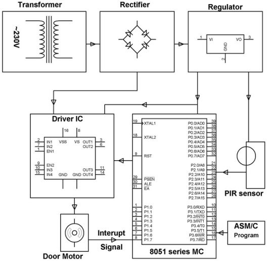 如果門附近有人體運(yùn)動,則人體發(fā)出的紅外輻射將使傳感器產(chǎn)生感應(yīng)信號,該信號被饋送到微控制器。然后,微控制器通過驅(qū)動器IC控制和操作門電機(jī)。因此,如果有人靠近門,則微控制器將發(fā)送一個命令以打開門,并設(shè)置一個延時時間以自動關(guān)閉門。該項目旨在用于購物商場,劇院和酒店的門。