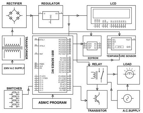 LCD用于顯示-55至+125度范圍內(nèi)的溫度。EEPROM用于由用戶通過8051系列微控制器存儲預(yù)定義的溫度設(shè)置。該繼電器的觸點(diǎn)用于負(fù)載,由微控制器使用晶體管驅(qū)動器驅(qū)動。