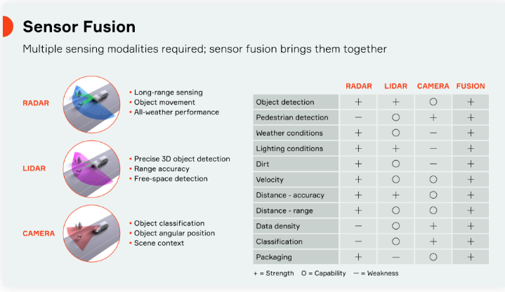 每種傳感器類型或“模態(tài)”都有其固有的優(yōu)點(diǎn)和缺點(diǎn)。雷達(dá)即使在惡劣的天氣條件下也能精確確定距離和速度,但是卻無法讀取路牌或“看見”交通信號(hào)燈的顏色。相機(jī)可以很好地讀取標(biāo)志或?qū)ξ矬w進(jìn)行分類,例如行人,騎自行車的人或其他車輛。但是,它們很容易被灰塵,陽光,雨水,雪或黑暗所蒙蔽。激光雷達(dá)可以準(zhǔn)確地檢測物體,但是它們沒有照相機(jī)或雷達(dá)的承受能力或承受能力。