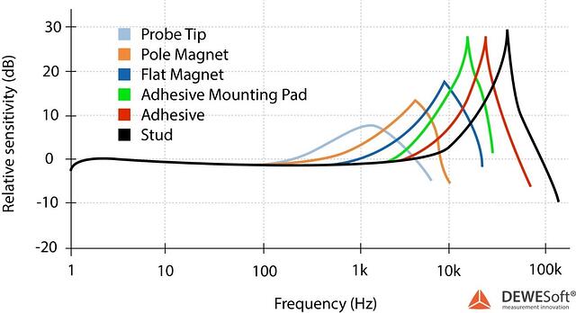 圖1:  不同安裝方式的加速度計的頻率響應。從DEWESoft的“振動測量課程”中拍攝和修改的圖像(值得一試!)。