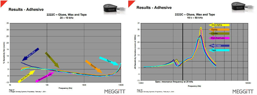 安裝加速度計時,需要考慮幾種不同的粘合劑。但是,令人驚訝的是,對于加速度計性能而言,最重要的參數(shù)不是膠粘劑類型,而是膠粘劑的厚度發(fā)揮了最大作用。圖4  提供了不同膠粘劑的頻率響應的一些曲線圖(數(shù)據(jù)來自相同的Endevco展示),說明了兩者之間的微小差異。