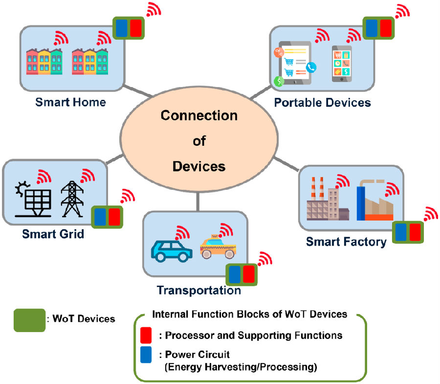 采用先進(jìn)的功率處理電路的技術(shù)已用于許多應(yīng)用的持續(xù)增長(zhǎng),例如無(wú)線(xiàn)傳感器網(wǎng)絡(luò),的IoT裝置,和家用電器。為了實(shí)現(xiàn)真正的物聯(lián)網(wǎng)(WoT)環(huán)境,需要用于各種連接設(shè)備的可靠電源電路。如圖1所示,此類(lèi)設(shè)備內(nèi)部的電源電路執(zhí)行能量收集和功率處理,以使這些設(shè)備可操作并連接至WoT。此類(lèi)WoT設(shè)備的處理器和發(fā)射器可以利用電源電路收集和處理的能量成功運(yùn)行。由于電源電路和不同類(lèi)型的電源都在WOT裝置,它們的設(shè)計(jì)工程師不應(yīng)忽視的功率電路(例如,能量采集接口)對(duì)系統(tǒng)性能的因素的影響,如可靠性,成本和效率。本文考慮的用于WoT應(yīng)用的電源示例包括電池和太陽(yáng)能電池。為了使不同電源有效且高效地運(yùn)行,系統(tǒng)設(shè)計(jì)人員應(yīng)考慮WoT設(shè)備中使用的電源電路的可靠電路控制策略和電源管理算法。