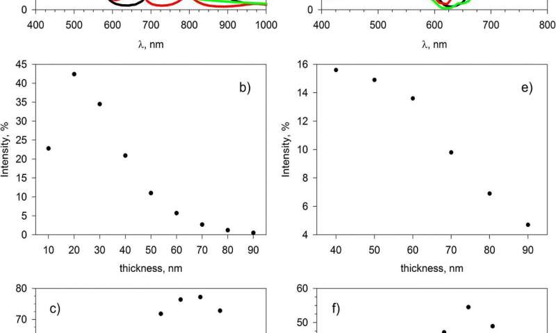 a)一維PC和PPC的透射光譜。虛線是PC的頻譜。粗線是具有30 nm Au層的PC的光譜。紅線是具有30 nm Au和270 nm緩沖層的PC的光譜。細(xì)線是30納米金層的透射光譜。b)對于Au層厚度的不同值,一維PPC的透射峰的強度。d)3D PC和PPC的透射光譜。虛線是PC的頻譜。粗線是具有40nm Au層(p極化)的PC的光譜。紅線是具有40nm Au和280nm緩沖層的PC的光譜。細(xì)線是具有40 nm Au層(s極化)的PC的光譜。e)繪制的3D PPC傳輸峰強度與金層厚度的關(guān)系 圖圖片來源:喀山聯(lián)邦大學(xué)