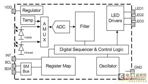 Si1143 紅外接近傳感器包括三個(gè)紅外LED驅(qū)動(dòng)器,紅外線光電二極管,一個(gè)環(huán)境光傳感器和控制邏輯IC組成,外部的發(fā)射LED可以根據(jù)用戶(hù)的需要靈活安裝和配置。如圖1所示。