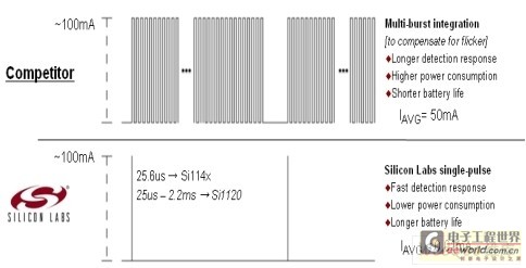 不像競(jìng)爭(zhēng)方案的紅外線LED必須長(zhǎng)時(shí)間進(jìn)行多次脈沖以達(dá)到精確的測(cè)量,Si1143紅外接近傳感系列使用專(zhuān)利的單一脈沖接近測(cè)量技術(shù)(如圖4所示),在電源效率上可達(dá)到5000倍的改善,電池壽命得以延長(zhǎng)。