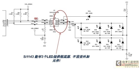 與Si1120不同的是,Si1143帶了三個(gè)LED驅(qū)動(dòng),當(dāng)連接多個(gè)紅外LED時(shí),如果只有單個(gè)LED驅(qū)動(dòng)(如圖6所示),則需通過(guò)MCU來(lái)控制MOS管分時(shí)驅(qū)動(dòng)LED,而Si1143(如圖7所示)本身就已具備3個(gè)LED驅(qū)動(dòng),所以可以直接連接到不同的LED 引腳,勿需再另加外圍器件,為硬件設(shè)計(jì)節(jié)省了成本。另外,Si1143采用?SMBus接口,可兼容I2C通訊,通用性更強(qiáng),同時(shí)也方便軟件的設(shè)計(jì)。