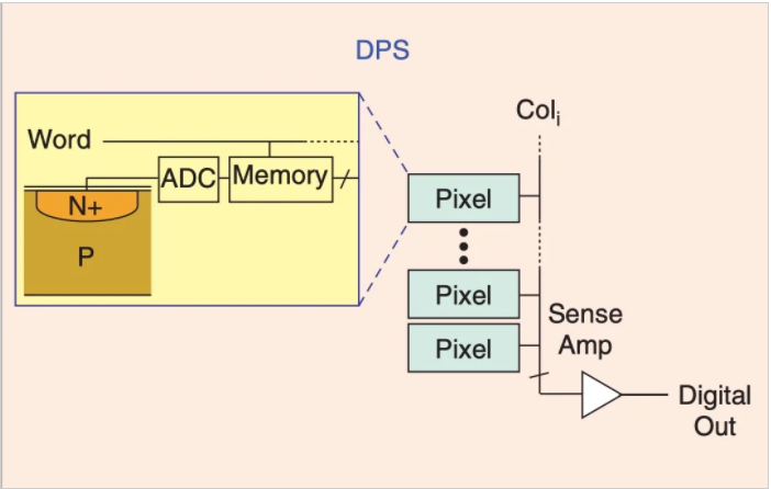 上圖顯示了APS(有源像素傳感器)架構(gòu)。在APS設(shè)備中,每個(gè)像素位置不僅包含光電二極管,而且包含放大器。一種稱為PPS(無源像素傳感器)的更簡(jiǎn)單的體系結(jié)構(gòu)沒有將放大器集成到像素中。在DPS(數(shù)字像素傳感器)設(shè)備中,每個(gè)像素都有自己的模數(shù)轉(zhuǎn)換器和存儲(chǔ)塊。因此,DPS體系結(jié)構(gòu)中的像素輸出與光強(qiáng)度成比例的數(shù)字值。