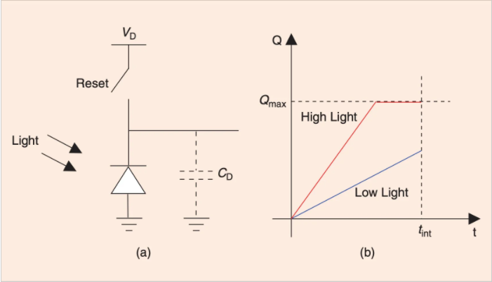 重置開關(guān)在曝光周期開始時(shí)閉合,以將光電二極管反向偏置到VD電壓。接下來,開關(guān)斷開,并產(chǎn)生與入射光強(qiáng)度成比例的光電流。該電流在毫微微安至皮安安的范圍內(nèi),并且太小而無法直接測(cè)量。如果我們讓光電二極管在設(shè)定的時(shí)間段內(nèi)(色調(diào))曝光,則電流將在二極管電容CD上積分。所存儲(chǔ)的電荷為我們提供了更容易測(cè)量的更強(qiáng)的累積信號(hào)。此外,合并的平均過程使累積的信號(hào)更真實(shí)地表示所測(cè)量的光強(qiáng)度,尤其是在處理微弱或嘈雜的信號(hào)時(shí)。