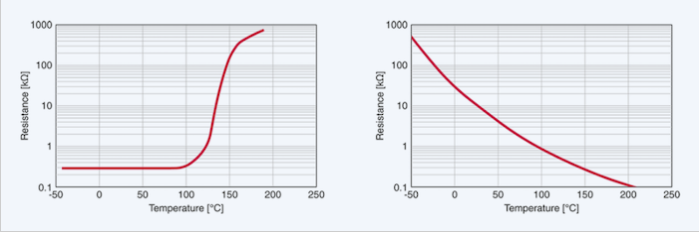 圖1. PTC和NTC熱敏電阻的電阻特性。