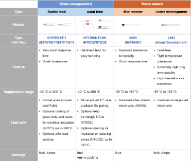 環(huán)氧樹脂涂層的NTC元件結(jié)構(gòu)堅(jiān)固,測量溫度通常在-55°C至+ 155°C之間,而玻璃封裝的NTC元件的測量溫度最高可達(dá)+ 300°C。對于需要極快響應(yīng)時(shí)間的應(yīng)用,玻璃封裝的元件是更合適的選擇。它們也更緊湊,直徑小至0.8mm。