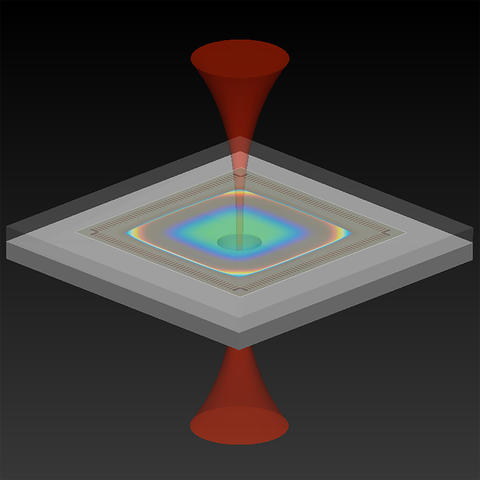光機(jī)械加速度計(jì)的圖示,它使用光來測(cè)量加速度。NIST設(shè)備由兩個(gè)硅芯片組成,紅外激光在底部芯片進(jìn)入,在頂部發(fā)射。頂部芯片包含由硅梁懸掛的標(biāo)準(zhǔn)質(zhì)量塊,該質(zhì)量塊使質(zhì)量塊可以響應(yīng)加速度自由上下移動(dòng)。檢測(cè)質(zhì)量上的鏡面涂層和連接到底部芯片的半球形鏡形成光學(xué)腔。選擇紅外光的波長(zhǎng),使其與腔體的諧振波長(zhǎng)幾乎匹配,從而使光在離開兩個(gè)反射鏡表面之間多次來回反射時(shí)逐漸增強(qiáng)強(qiáng)度。當(dāng)設(shè)備加速時(shí),檢測(cè)質(zhì)量就會(huì)移動(dòng),從而改變腔體的長(zhǎng)度并改變共振波長(zhǎng)。這改變了反射光的強(qiáng)度。光學(xué)讀數(shù)將強(qiáng)度的變化轉(zhuǎn)換為加速度的量度。