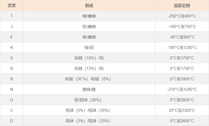 有幾種類型的熱電偶對(duì)應(yīng)于不同的金屬對(duì)。 每對(duì)金屬都有不同的測(cè)量范圍: