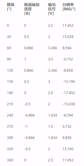 在本例中,加速度傳感器圍繞X軸或Y軸旋轉360°。表一顯示了相應的角度[°], 通過敏感軸得到的加速度[g], 輸出信號 [V], 和分辨率 [mg/°] 。從分辨率對角度的關系中,我們可以清楚地看到,盡管加速度傳感器可以在360°以上的范圍內提供信號,它的最佳的工作區(qū)域是在 0°和180°附近±30°的線性和對稱區(qū)間。