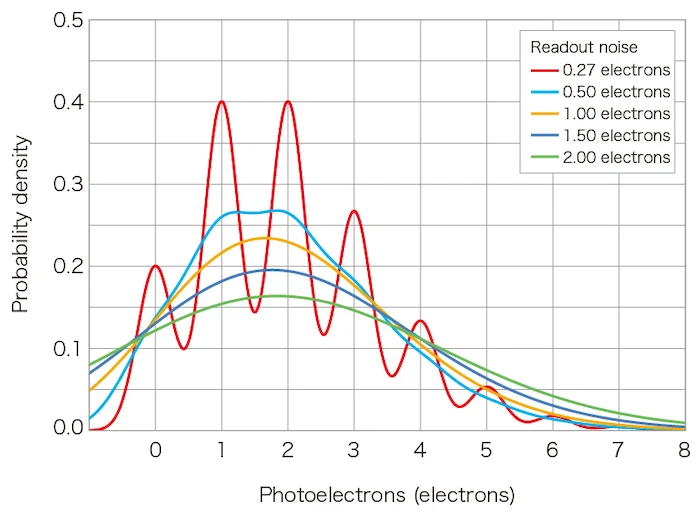 如下所示,對(duì)于 0.5 個(gè)電子及以上的讀出噪聲,將失去檢測(cè)單個(gè)光電子的能力。