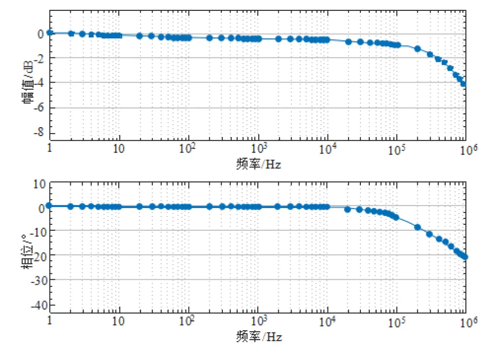 使用恒溫箱將TMR電流傳感器的工作環(huán)境設(shè)置為25℃室溫,斷開亥姆赫茲線圈的供電電流源,保持測試環(huán)境的純凈。因為電流源可以產(chǎn)生電流的頻率有限,采用信號發(fā)生器配合功率放大器ATA-4012對閉環(huán)式TMR電流傳感器進行頻率響應(yīng)測試。將TMR電流傳感器的輸出接入雙通道示波器的A通道,同時將輸入信號一并接入示波器另一通道B。保持待測電流的幅值不變,改變其電流頻率,觀察閉環(huán)TMR電流傳感器的輸入和輸出信號之間的相位差,測量TMR電流傳感器時將電流設(shè)定為0.2A,得到下圖所示的不同頻率下閉環(huán)TMR電流傳感器的頻率響應(yīng)特性。