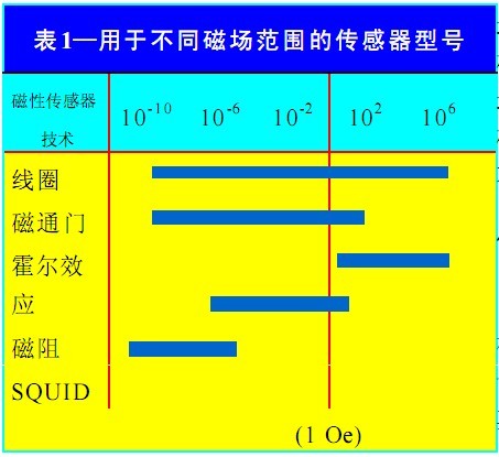 磁場(chǎng)測(cè)量可分為三個(gè)范圍。在每個(gè)范圍中,能在其環(huán)境中處于最佳工作狀態(tài)的磁性傳感器型號(hào)也不同。第一個(gè)磁場(chǎng)范圍遠(yuǎn)大于地球磁場(chǎng)(如在永久磁鐵或大電流附近)。其范圍為 100 奧斯特(Oe) 或更高。第二個(gè)磁場(chǎng)范圍約等于地球磁場(chǎng)或0.6 Oe 。第三個(gè)磁場(chǎng)范圍遠(yuǎn)遠(yuǎn)小于地球磁場(chǎng),它們?cè)?1 mOe 或更低范圍內(nèi)。地球磁場(chǎng)常用作受鐵磁物體干擾的背景磁場(chǎng),如在磁異態(tài)檢測(cè)中的鐵磁物體。表 1 給出了用于不同磁場(chǎng)范圍的傳感器型號(hào) !