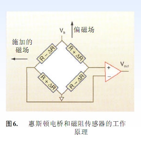 惠斯頓電橋是磁阻傳感器的基礎(chǔ)電氣元件。圖5說(shuō)明了磁阻傳感器的工作原理和一個(gè)MR板對(duì)外部磁場(chǎng)的典型響應(yīng)。圖6所示為用四個(gè)磁控電阻器制成的惠斯頓電橋帶有一個(gè)供電電壓Vb,致使電流通過(guò)電阻器。如圖所示,施加一個(gè)偏磁場(chǎng),使在所有電阻中的磁化強(qiáng)度和電流間有一個(gè)約45°的夾角。如果電阻器是同一種結(jié)構(gòu),則所有四個(gè)電阻器的電阻是相同的,正交施加磁場(chǎng)h的R.A,使兩個(gè)反向放置的電阻器磁化而轉(zhuǎn)向電流,使電阻有一個(gè)增量△R,在剩下的兩個(gè)反向放置的電阻器中,由于磁化而轉(zhuǎn)離電流,導(dǎo)致電阻減少△R 。