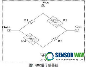 VA系列巨磁電阻磁傳感器采用惠斯通橋式結(jié)構(gòu),如圖1所示的。圖中,R1和R3是兩個(gè)阻值一樣的電阻,可隨外界磁場(chǎng)的變化輸出一個(gè)差分電壓信號(hào),R2和R4由于屏蔽層的作用不感應(yīng)外界磁場(chǎng)的變化。
