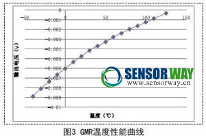 將GMR芯片放入高低溫?zé)o磁溫度箱中,每隔10℃記錄一次數(shù)據(jù),監(jiān)測(cè)傳感器從-40℃~+125℃隨溫度變化的漂移性,具體如圖3所示,芯片在整個(gè)溫度范圍內(nèi)輸出變化9.075mv,溫度系數(shù)為0.055mV/℃,可見(jiàn)GMR傳感器芯片的溫度性能比較優(yōu)越。