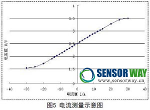 在實(shí)際應(yīng)用中,待測(cè)電流有正負(fù)之分,產(chǎn)生的磁場(chǎng)有正負(fù)之分,因此,在測(cè)試過(guò)程中,通過(guò)改變磁場(chǎng)方向和電流的方向來(lái)檢測(cè)GMR傳感器和電流傳感器測(cè)試性能。圖5是電流從-30A到+30A變化時(shí)電流傳感器輸出曲線。