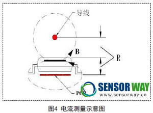 巨磁電阻用于電流檢測(cè)一般采用如圖4所示的方式進(jìn)行,將磁傳感器放置通電導(dǎo)線的正上方或正下方,同時(shí)保證通電導(dǎo)線產(chǎn)生磁場(chǎng)的方向與磁傳感器的敏感方向一致。按照通電導(dǎo)線周圍產(chǎn)生磁場(chǎng)的理論計(jì)算公式2-1可知,在待測(cè)電流和傳感器相對(duì)位置一定的情況下,待測(cè)電流的大小和磁場(chǎng)大小成正比,利用公式2-2這樣就可以直接測(cè)量待測(cè)電流產(chǎn)生的磁場(chǎng)值,再結(jié)合公式2-1就得出待測(cè)電流的大小。