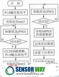 根據(jù)傳感器的操作要求,設(shè)置無線瓦斯傳感器按照以下的流程進(jìn)行工作。節(jié)點處于工作/休眠交替狀態(tài),一個工作周期約為10 min.在前8分30秒中CC2430的P1.0引腳輸出低電平,控制MIPEX傳感器不工作。緊接著,CC2430進(jìn)入低功耗運行模式。8分30秒過后,CC2430被喚醒,P1.0引腳輸出高電平,即給MIPEX傳感器供電。此時CC2430進(jìn)入PM1低功耗模式。由于MIPEX傳感器的熱身時間為1min,這里設(shè)置70s后,CC2430被喚醒,開始讀取MIPEX中的瓦斯?jié)舛刃畔,然后將其無線發(fā)送出去。待發(fā)送完畢后,設(shè)置下一次瓦斯?jié)舛茸x取事件,周期為20 s,這20 s內(nèi),CC2430自動進(jìn)入低功耗模式。20 s之后,觸發(fā)該事件,并送給應(yīng)用層處理,開始了上述循環(huán)過程。程序設(shè)計的具體流程如圖1所示。