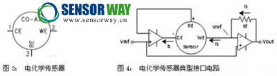 電化學(xué)式傳感器通常是電流方式輸出,信號(hào)的靈敏度從幾十nA/ppm到幾百nA/ppm,其數(shù)值根據(jù)氣體的種類不同而不同。另外,不同廠家的傳感器也略有差異。此類傳感器一般3個(gè)引腳,分別是工作電極(WE)/參考電極(RE)/對(duì)電極(CE)。 工作電極與對(duì)電極之間流動(dòng)的電流與氣體濃度成比例。參考電極沒有電極流動(dòng),只是提供一個(gè)參考電壓。對(duì)于不同氣體傳感器,參考電壓會(huì)有所不同,設(shè)計(jì)后端電路時(shí)要仔細(xì)閱讀產(chǎn)品手冊(cè)。
