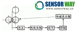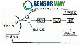 圖4為包裝物料的光電色質檢測原理。若包裝物品規(guī)定底色為白色,因質量不佳,有的出現(xiàn)泛黃,在產(chǎn)品包裝前先由光電檢測色質,物品泛黃時就有比較電壓差輸出,接通電磁閥,由壓縮空氣將泛黃物品吹出。