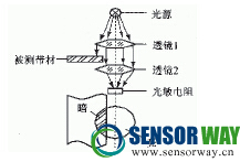 光電式帶材跑偏檢測器原理如圖1所示。光源發(fā)出的光線經(jīng)過透鏡1會聚為行光束,投向透鏡2,隨后被會聚到光敏電阻上。在平行光束到達透鏡2的途中,有部分光線受到被測帶材的遮擋,使傳到光敏電阻的光通量減少。
