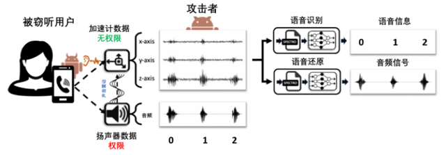 “加速度傳感器是目前智能手機中最常見的一種嵌入式傳感器,主要用于探測手機本身的移動,常見的應(yīng)用場景包括移動檢測、步數(shù)統(tǒng)計、游戲控制等。”任奎告訴記者,它之所以能被用來監(jiān)聽電話,主要是由于智能手機本身的物理結(jié)構(gòu),“由于聲音信號是一種由震動產(chǎn)生的可以通過一些介質(zhì)進行傳播的聲波,因此手機揚聲器發(fā)出的聲音會引起手機的震動,而加速度傳感器可以準(zhǔn)確感知到這些震動,因此攻擊者可以通過它來捕捉聲音信號引起的手機震動進而推斷出其中所包含的敏感信息!