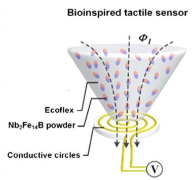 本研究的研究人員設(shè)計了一種新型的輕觸傳感器,該傳感器模仿了在我們皮膚中發(fā)現(xiàn)的默克爾圓盤的功能和結(jié)構(gòu)-對輕觸產(chǎn)生反應(yīng)的神經(jīng)末梢。新的觸覺傳感器利用了磁電效應(yīng),它由兩個不同的部分組成:第一個是復(fù)合混合物,由磁粉和彈性體組成,形成一個彈性磁塊,實際上它對默克爾圓盤的反應(yīng)相似。傳感器的后半部分由導(dǎo)電的盤繞銅線組成(見圖)。