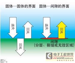 如果兩種材料之間存在間隙,則此位置不再是塑料-金屬界面,而是塑料-真空或者可能是塑料-空氣界面。由于后一材料不是固體,界面處的聲學特性發(fā)生了極大的變化,使傳回的回聲振幅極高(圖1),且大于兩種粘合良好的固體產(chǎn)生的回聲。一般>99.99%的脈沖超聲波將被反射,即便間隙僅有0.01 µm,工程師也會看到十分明亮的間隙區(qū)域。