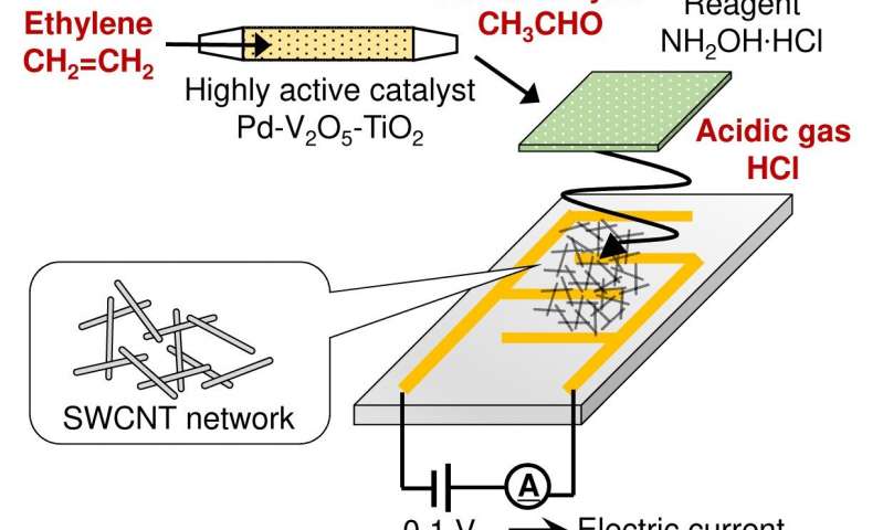 在此研究項(xiàng)目中,我們開發(fā)了一種小型,高靈敏度的傳感器,能夠以高選擇性檢測乙烯。該傳感器由三部分組成:一種高活性催化劑,可選擇性地將乙烯轉(zhuǎn)化為乙醛;一種與乙醛反應(yīng)以釋放酸性氣體的試劑;以及一個(gè)對酸性氣體非常敏感的SWCNT(單壁碳納米管)電極(圖)。當(dāng)分析物空氣通過時(shí),這種高活性催化劑可以將乙烯反復(fù)轉(zhuǎn)化為乙醛。此外,該催化劑可在接近室溫(40℃)的條件下運(yùn)行,從而使小型傳感器具有較高的能源效率。乙醛與試劑之間的反應(yīng)產(chǎn)生的酸性氣體會(huì)從SWCNT半導(dǎo)體中強(qiáng)烈吸收電子,從而改變半導(dǎo)體的電阻。這些特性和機(jī)制使傳感器能夠通過監(jiān)視電阻變化,即使在極低的濃度(0.1 ppm)下也能夠選擇性和靈敏地檢測乙烯。該傳感器有望有效監(jiān)測多種類型乙烯的乙烯濃度。儲(chǔ)存新鮮農(nóng)產(chǎn)品。例如,促進(jìn)香蕉和獼猴桃中成熟的乙烯濃度分別約為500 ppm和10 ppm:完全在傳感器的有用靈敏度范圍內(nèi)。