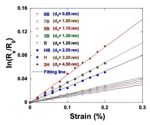 不同等級鉛筆的相對電阻與施加應(yīng)力之間的關(guān)系。差異源自相鄰石墨之間的初始隧穿距離的變化。