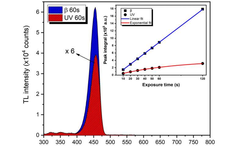 第二個(gè)是兩個(gè)響應(yīng)會(huì)根據(jù)不同的模式而變化,從而可以在未來(lái)的設(shè)備中解決紫外線干擾問(wèn)題。該材料以線性方式響應(yīng)β射線:隨著其對(duì)電離輻射的暴露增加,其發(fā)光強(qiáng)度以連續(xù)曲線遞增。在紫外線輻射的情況下,材料的發(fā)光度不會(huì)線性變化。Trindade說(shuō):“有一個(gè)飽和點(diǎn),在這個(gè)飽和點(diǎn)之后,即使繼續(xù)暴露,發(fā)光也會(huì)停止增強(qiáng)!