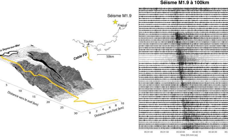 位于弗雷瑞斯(瓦爾)以北的1.9級地震產生的地震波記錄在沿土倫附近海底部署的41公里長的光纜上。在右側的記錄中,每條線對應一個沿著電纜的測量點,從海岸(頂部)到大海(底部)。(41公里的電纜相當于6000多個傳感器)。各個測量點處的波到達時間之差用于確定地震的位置。
