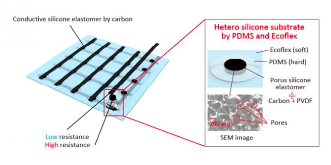 有機(jī)硅基材由兩種不同類型的有機(jī)硅制成-一種硬而一種軟。較硬的有機(jī)硅(PDMS)可以抑制壓力感應(yīng)元件在應(yīng)變下的變形。圖片由橫濱國(guó)立大學(xué)大田裕樹提供