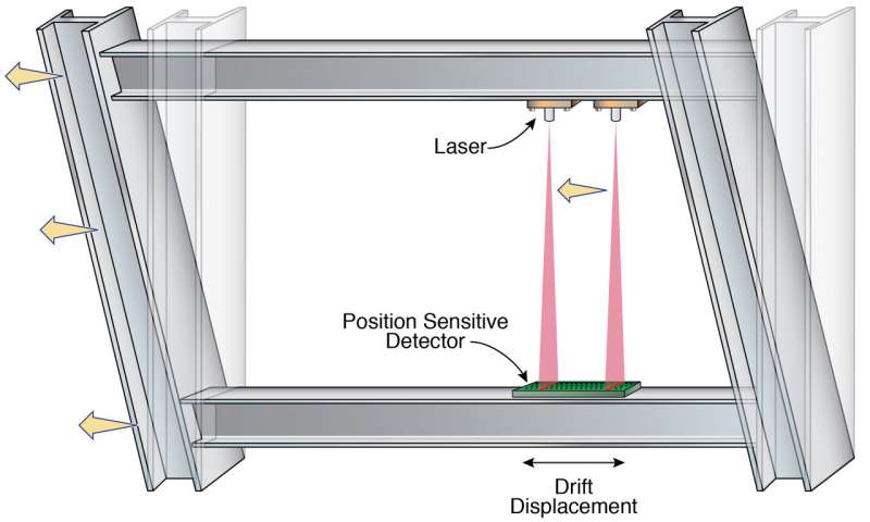 DDPS利用了一種很有前途的新選擇,可以直接測量結(jié)合激光束和光學(xué)傳感器的建筑物層間漂移。這項技術(shù)的重點是將激光投射到整個樓層高度,以檢測光線照射到位于相鄰建筑物地板上的檢測器的位置,從而直接測量結(jié)構(gòu)漂移。伯克利實驗室開發(fā)的工具依賴于利用激光源和位置敏感檢測器。利用小型,廉價的光敏光電二極管的幾何陣列,該傳感器能夠立即跟蹤入射激光束的位置。