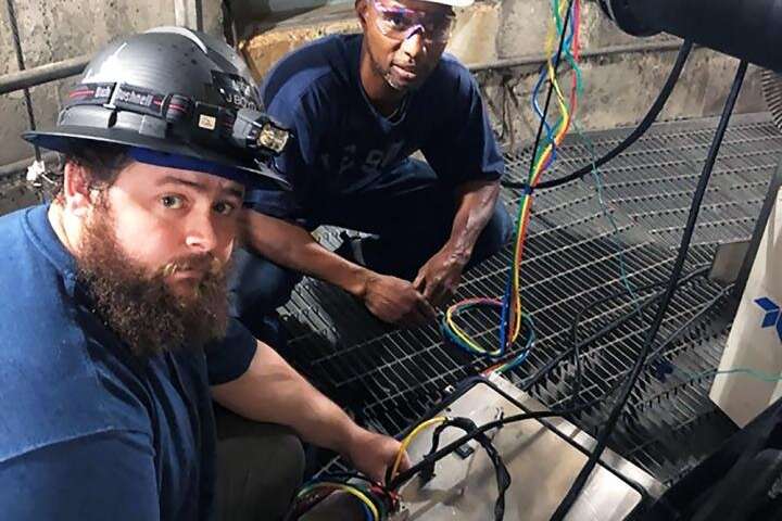NIST的Joey Boyd(左)和Aaron Johnson在發(fā)電廠進行了新傳感器的測試。平臺使他們可以進入煙囪,該平臺位于地面上方約45米處。圖片來源:Tom Martz / EPRI