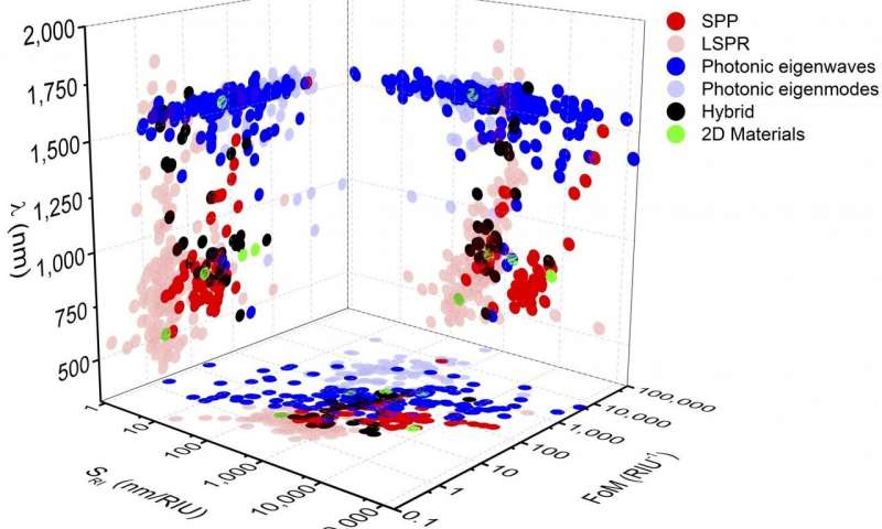 來(lái)自新加坡新加坡科技設(shè)計(jì)大學(xué)(SUTD),新加坡科學(xué)技術(shù)研究局(A * STAR)和奧地利奧地利技術(shù)學(xué)院的研究人員進(jìn)行了廣泛的文獻(xiàn)研究,系統(tǒng)地總結(jié)和比較了傳感能力這些光學(xué)折射率傳感器的靈敏度和優(yōu)劣系數(shù)的比較。然后建立了3-D技術(shù)圖(見(jiàn)圖1),以定義使用等離子和光子結(jié)構(gòu)的光學(xué)折射率傳感器的標(biāo)準(zhǔn)和發(fā)展趨勢(shì)。